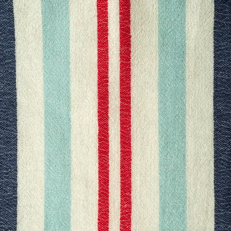Übergroßer Schal in Weiß mit blauen und roten Streifen. 200 x 90 cm.