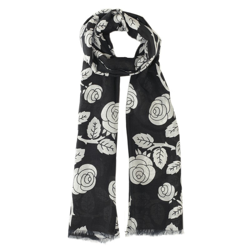 Schwarzes Tuch mit weißen Blumendruck, aus einer hochwertigen, temperaturausgleichenden Seidenmischung.