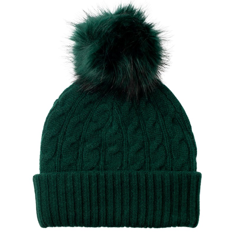 Flaschengrüne Mütze aus Kaschmir mit Faux-Fur Pompon.